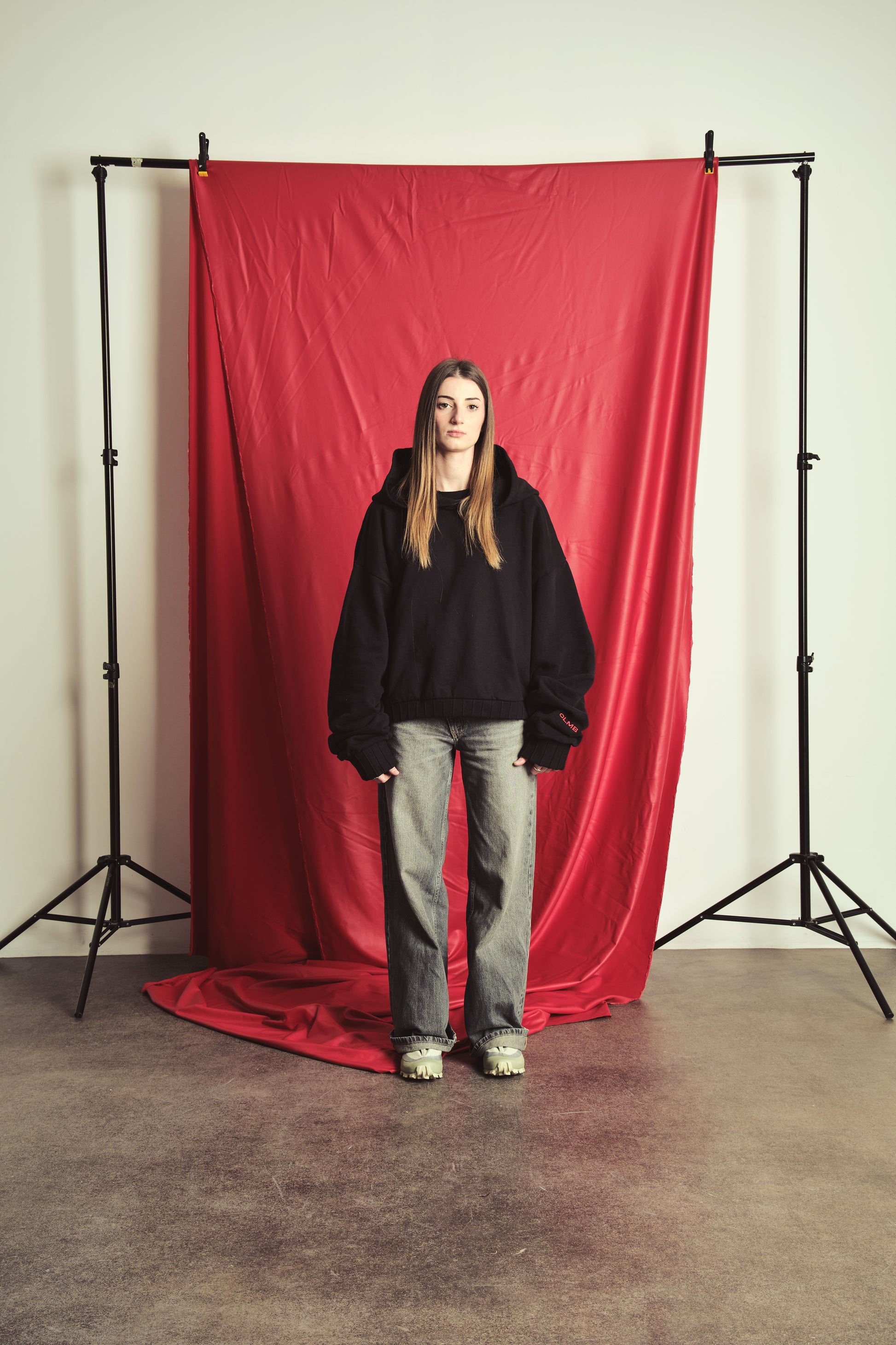 Felpa con cappuccio nera dalla mano morbida al tatto e finitura tinta in pezza.